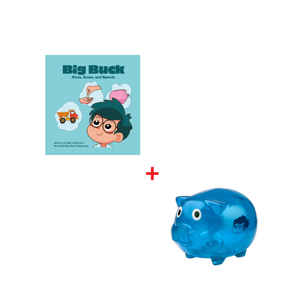 Our combo set comes with both the paperback book, "Big Buck Gives, Saves, and Spends", plus the piggy bank with Big Buck's face custom printed on the front.